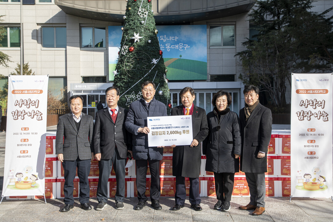 [대학저널 오혜민 기자]서울시립대학교는 14일 동대문구 광장에서 이필형 동대문구청장과 신복자 서울시의원, 서울시립대 학생 봉사단 등과 사랑의 김장 나눔 행사를 열었다.