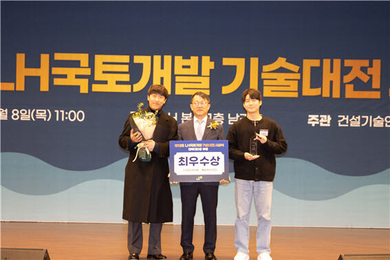 전남대 토목공학과 정영준·박광영 학생이 ‘LH국토개발기술대전’에서 최우수상을 받은 후 기념촬영하고 있다. 사진=전남대 제공 |