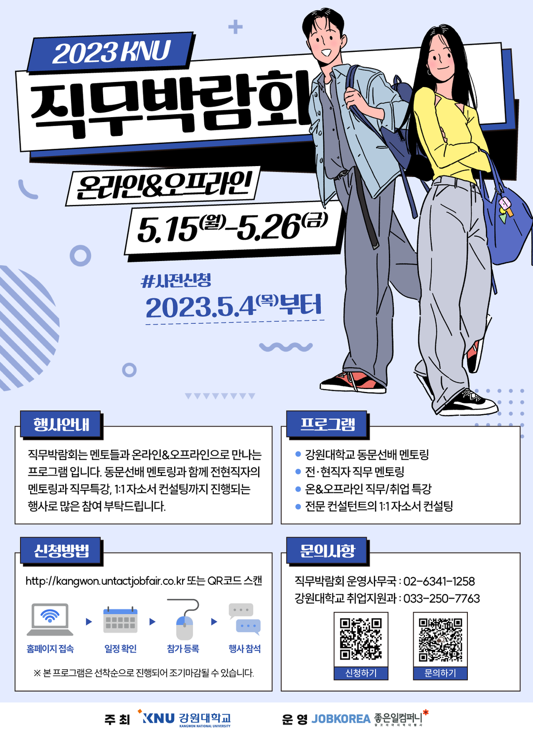 직무박람회에는 학생과 졸업생 뿐만 아니라 취업과 진로를 고민하는 청년이라면 누구나 참여할 수 있다. 참가 신청은 박람회 홈페이지 또는 강원대 취업지원과를 통해 할 수 있다.