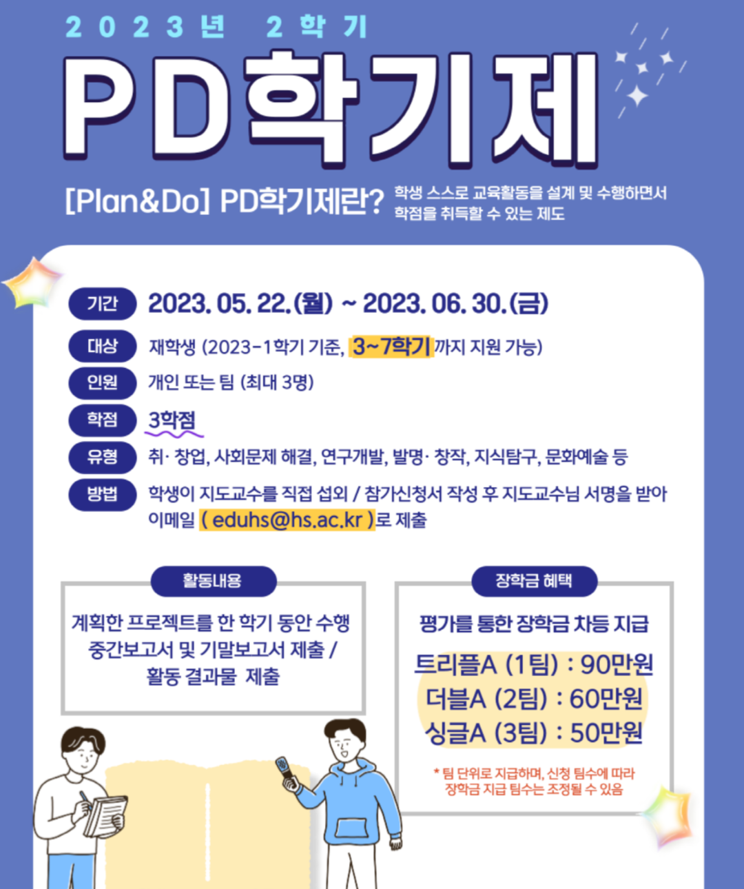 PD학기제의 PD는 ‘Plan&Do’의 약자로, 학생 스스로가 교육활동을 설계하고 수행하면서 학점을 취득할 수 있는 제도다. 취득할 수 있는 학점은 3학점이며 평가 결과에 따라 장학금도 받을 수 있다.