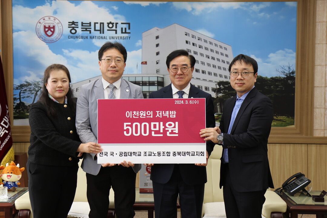 충북대는 3월 6일 오전 11시 대학본부 5층 접견실에서 전국 국·공립대학교 조교노동조합 충북대지회가 ‘이천원의 저녁밥’을 위해 써달라며 충북대에 5백만 원을 기탁했다고 밝혔다.