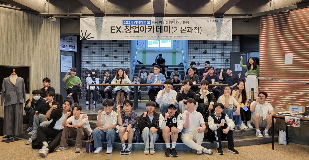 경남대 2024 학생 창업유망팀 300+ 진출팀이 기념촬영을 하고 있다. 사진=경남대 제공 |