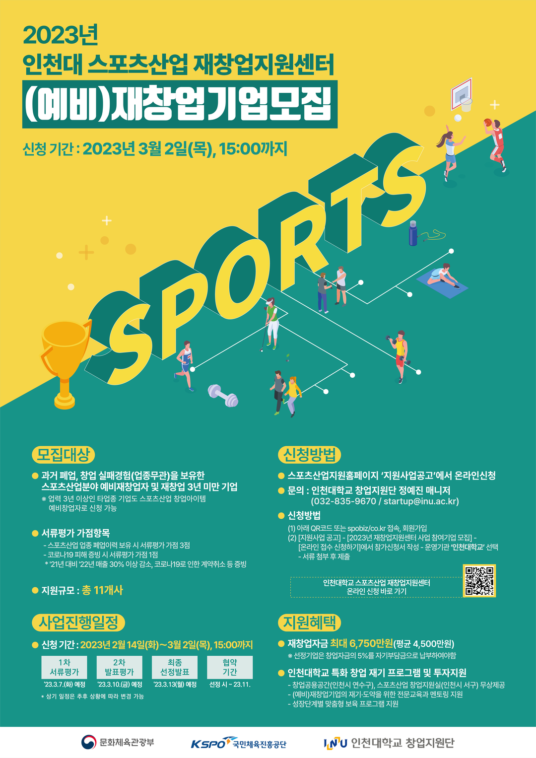 22일 인천대에 따르면 신청 자격은 과거 폐업과 창업 실패 경험을 보유한 스포츠분야 예비재창업자와 재창업 3년 미만 기업이다.