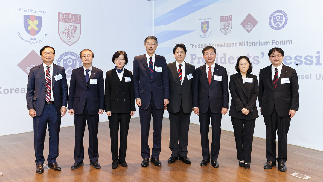 왼쪽부터 연세대 김동훈 국제처장, 박승한 연구부총장, 김은경 교학부총장, 게이오대 이토 코헤이 총장, 츠치야 모토히로 국제처장, 고려대 정진택 총장, 이희경 국제처장, 와세다대 젬마 마사히코 국제처장. |