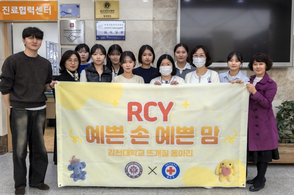 [대학저널 온종림 기자] 김천대학교 뜨개질 동아리 ‘예쁜 손 예쁜 맘’은 지난 5일 김천 제일병원 소아병동을 방문해 직접 손뜨개로 만든 인형을 어린이 환자들에게 선물했다. 이번에 선물한 인형들은 학생들이 정성을 다해 하나하나 만든 세상에 하나뿐인 작품들로, 환아들에게 큰 기쁨을 주었다.