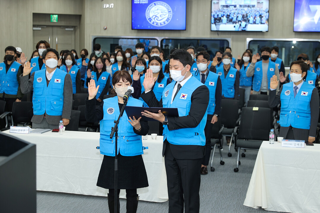영남대학교 ‘YU 사회공헌단’ 발대식에서 단원들이 선서문을 낭독하고 있다. 사진=영남대 제공 |