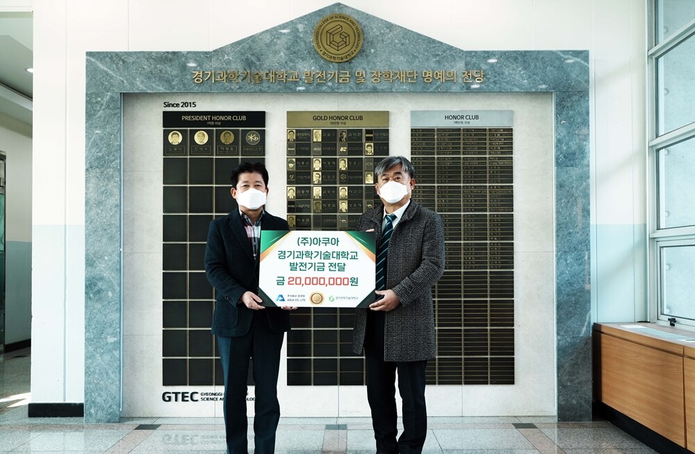 경기과학기술대에 따르면 아쿠아는 그동안 경기과기대의 우수한 산학협력시스템을 통해 사업 성장에 많은 도움을 받아온 것에 보답해 발전기금을 기탁했다.