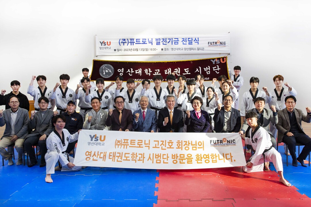| 영산대학교 태권도학과 시범단과 (주)퓨트로닉 고진호 회장님의 발전기금 전달식. 출처=영산대학교 제공 |