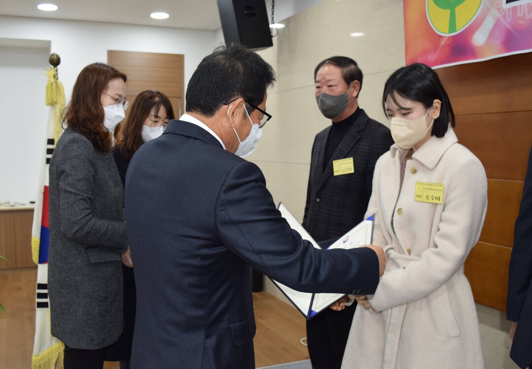 | 순천대학교 무역학전공 조수아 씨가 지난달 29일 순천시 상공회의소에서 열린 ‘2022 순천시새마을 평가대회’에서 행정안전부장관 표창을 받고 있다. 사진=순천대 제공 |