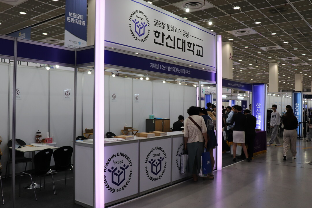 [대학저널 조영훈 기자]한국대학교육협의회가 주최하는 '2024학년도 수시 입학정보박람회'가 20일 서울 삼성동 코엑스에서 개막됐다. 오는 22일까지 열리는 수시박람회에는 전국 146개 대학이 참가하고 있다. 현재 수험생들이 대학부스에서 입시 상담을 진행하고 있다. 사진은 한신대학교 부스 모습.