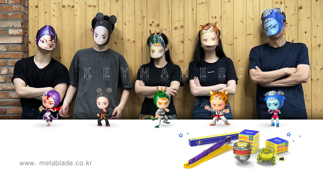 한국공대 교원창업기업 ㈜키메이커스 멤버와 메타블레이드. 사진=㈜키메이커스 제공 |