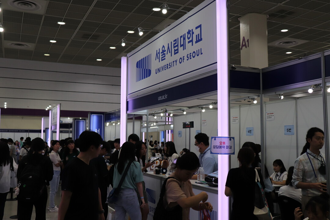[대학저널 조영훈 기자]한국대학교육협의회가 주최하는 '2024학년도 수시 입학정보박람회'가 20일 서울 삼성동 코엑스에서 개막됐다. 오는 22일까지 열리는 수시박람회에는 전국 146개 대학이 참가하고 있다. 현재 수험생들이 대학부스에서 입시 상담을 진행하고 있다. 사진은 서울시립대학교 상담부스 모습.