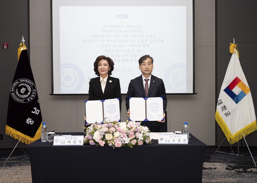 한밭대 오용준 총장과 충남대 이진숙 총장 등 양 대학 관계자들은 이날 오후 대전시 유성구 호텔오노마에서 ‘한밭대학교-충남대학교 대학통합 논의 공동 선포식’을 진행했다.