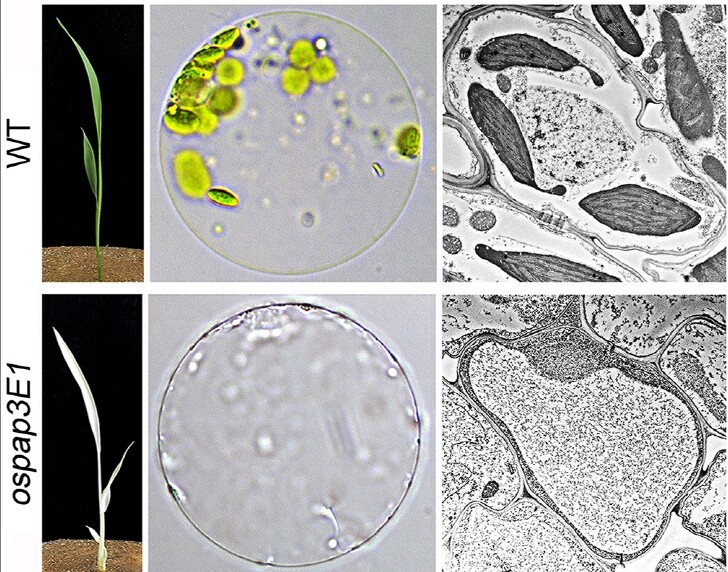 정상 벼와 발굴 유전자가 돌연변이 된 벼의 엽록체 발달을 보여주는 결과. |