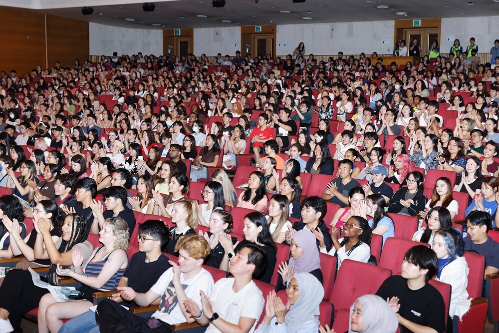 26일 연세대 대강당에서 열린 2023년 연세대 국제하계대학 오리엔테이션에 참가한 외국 학생들이 축하 공연을 보고 있다. 사진=연세대 제공 |