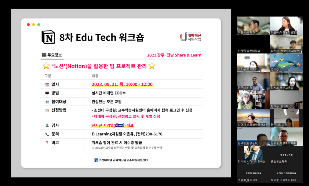 온라인으로 진행된 이번 워크숍 주제는 ‘노션(Notion)을 활용한 팀 프로젝트 관리’로 조선대, 전남대, 목포대를 비롯해 지역 13개 대학의 교직원 154명이 참여했다.