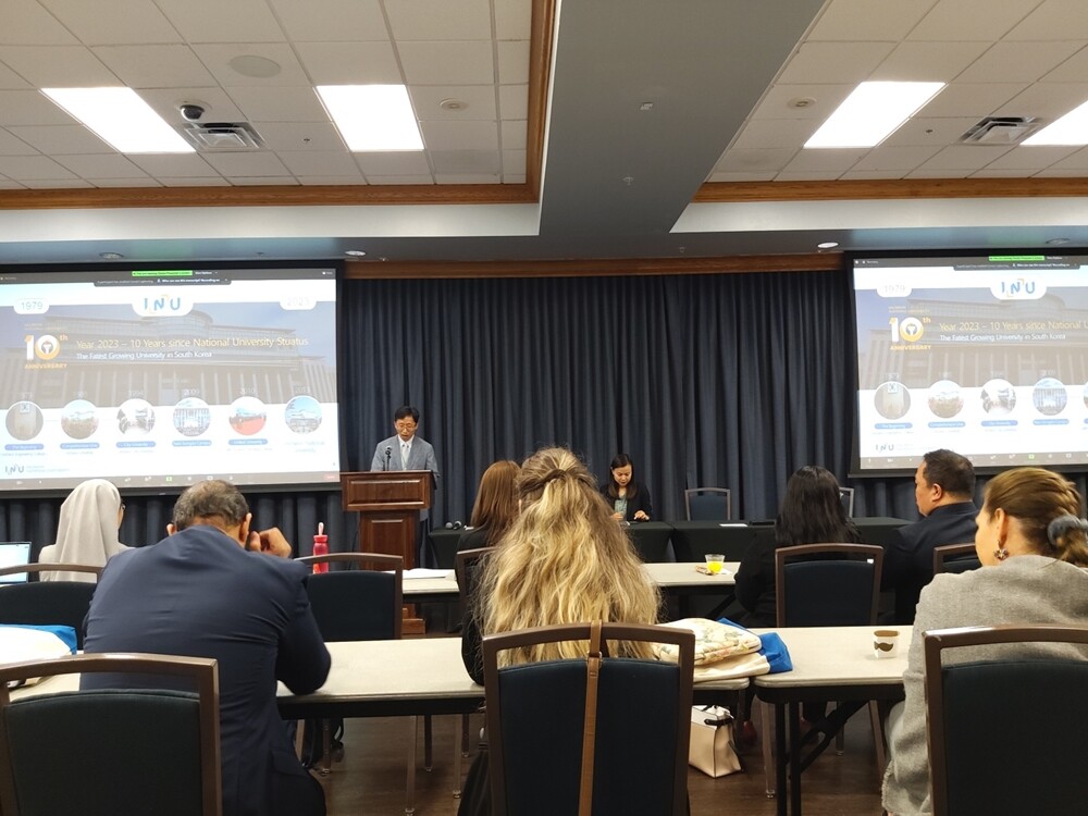 인천대 최병조 교무처장이 지난 17일(현지시간) 미국 플로리다 걸프코스트대에서 열린 WURI랭킹 우수사례발표에서 인천대 혁신사례를 소개하고 있다. 사진=인천대 제공 |