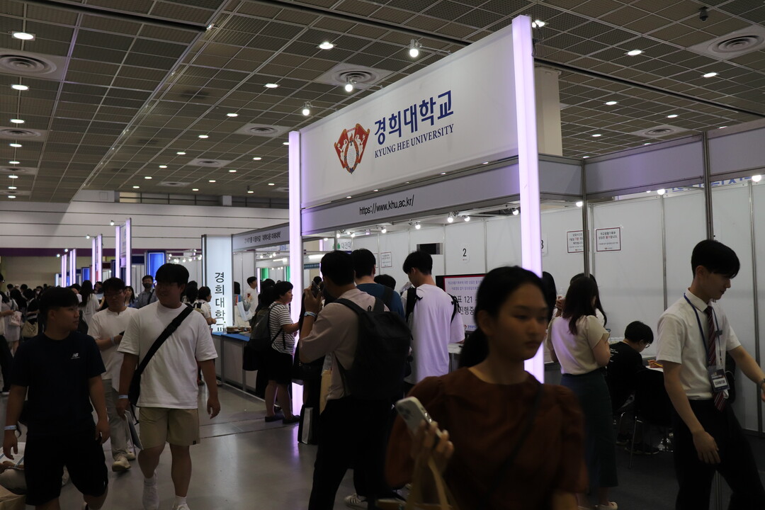 [대학저널 조영훈 기자] 한국대학교육협의회가 주최하는 '2024학년도 수시 입학정보박람회'가 20일 서울 삼성동 코엑스에서 개막됐다. 오는 22일까지 열리는 수시박람회에는 전국 146개 대학이 참가하고 있다. 현재 수험생들이 대학부스에서 입시 상담을 진행하고 있다. 사진은 경희대학교 상담부스 모습.