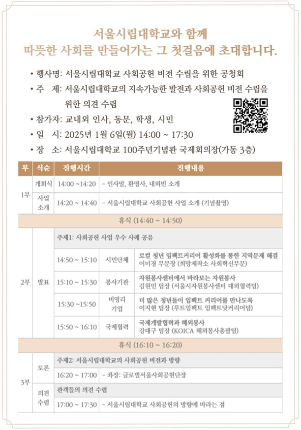 이번 공청회는 서울시립대가 신설한 글로벌서울사회공헌단 주관으로 진행되며, 대학의 사회공헌 활동 방향과 목표를 논의하기 위해 마련된 자리이다. 사회공헌 전문가, 지역사회 대표 등 다양한 이해관계자와 시민들이 함께 참여해 공립대학으로서의 사회적 역할을 재조명하고 대학이 지역사회와 글로벌 사회에 기여할 수 있는 방안을 폭넓게 모색할 예정이다.