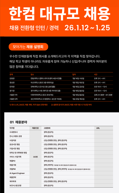 설명회에서는 한글과컴퓨터의 ‘2026 채용 전형 안내(전환형 인턴/경력)’를 비롯해 ▲SW개발 ▲AI ▲영업·마케팅 ▲경영지원 등 분야별 직무 소개와 질의응답(Q&A)이 진행된다.