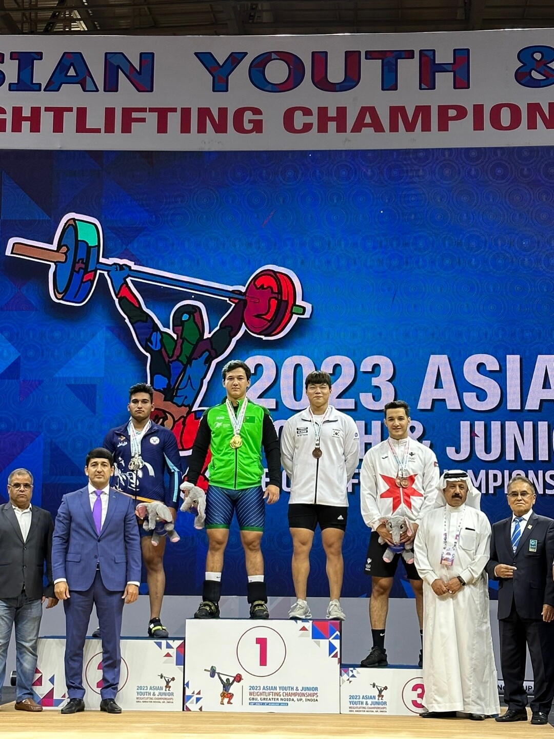 신성대 차병준 선수가 3일 인도 델리에서 열린 2023 아시아주니어역도선수권대회 96㎏급 인상에서 147㎏을 들어올리며 동메달을 획득한 후 시상대에서 메달을 목에 걸고 있다. 사진=신성대 제공 |