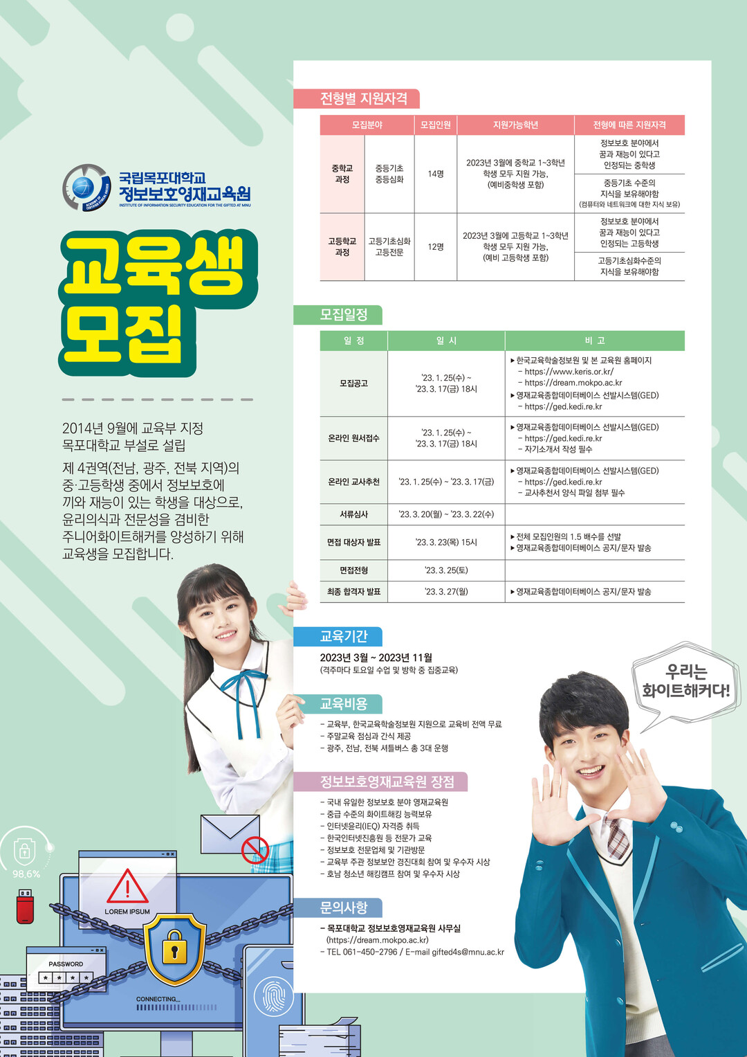 | 국립목포대학교 '2023년 정보보호영재교육원 교육생 추가모집' 포스터. 출처=국립목포대학교 제공 |