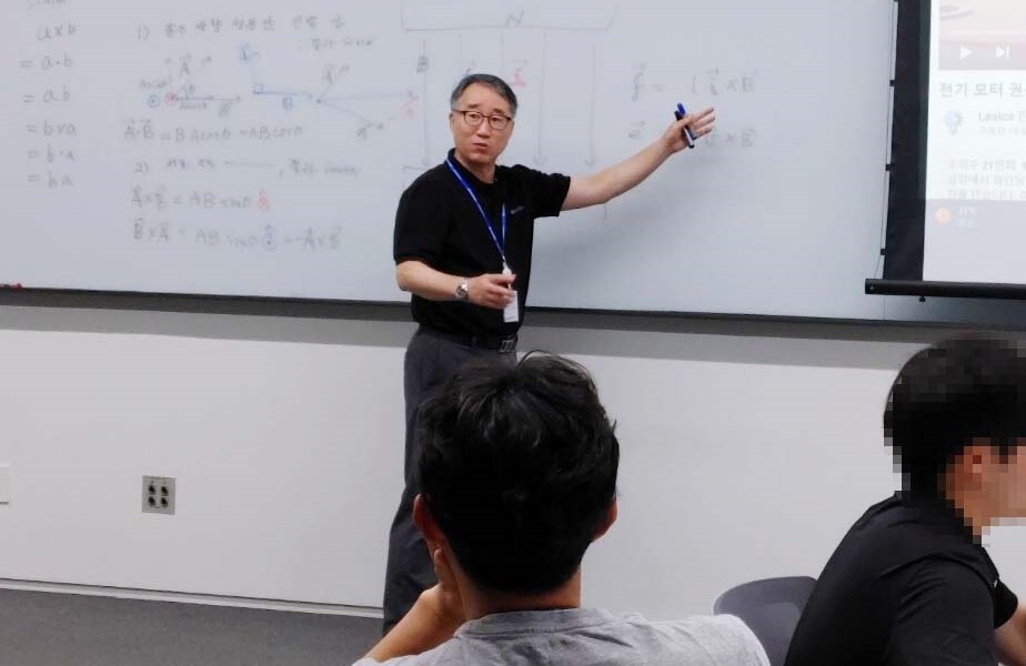 현대차 경주캠퍼스에서 자동차용 제어 전동기 이론 교육을 강의하는 백인철 교수. 사진=경기과기대 제공 |