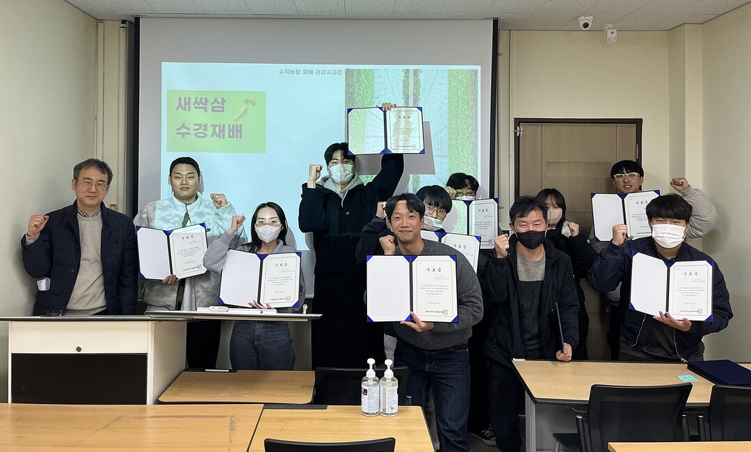 | 목포대학교 '수직농장 재배 관리사' 교육과정을 수료한 참가자들이 수료증을 들고 파이팅을 외치고 있다. 사진=목포대 제공 |