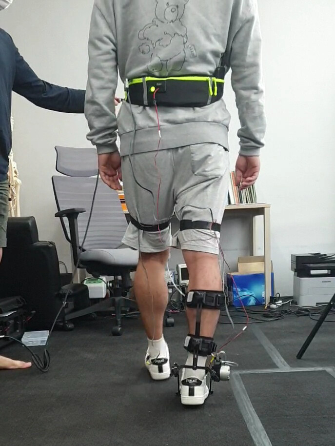 청주대 스포츠재활학과가 미 하버드의대와 새로운 보행 보조 기술을 개발했다. 사진은 새로운 전기자극 기술인 ‘transcutaneous interferential-current nerve inhibition(TINI)’과 소형 발목 보조 로봇을 결합해, 보행 시 발목 굴곡 범위를 향상시키는 기술을 확인하고 있는 장면. 사진=청주대 제공 |
