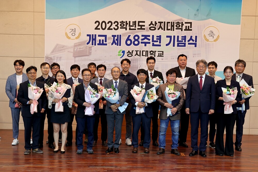 상지대 관계자들이 9일 본관 강당에서 개교 68주년 기념식을 한 뒤 기념촬영하고 있다. 사진=상지대 제공 |
