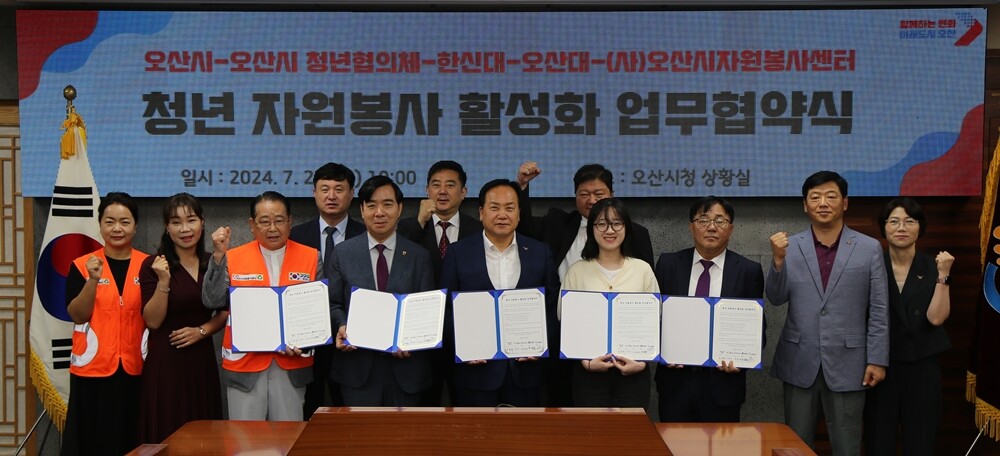 [대학저널 온종림 기자] 한신대학교와 오산시, 오산시청년협의체, (사)오산시자원봉사센터, 오산대학교가 23일 오산시청 2층 상황실에서 ‘청년 자원봉사 활성화를 위한 업무협약’을 체결했다.