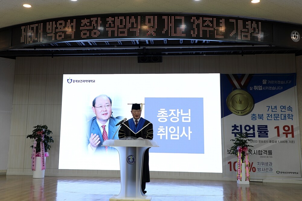 충북보건과학대 제5대 박용석 총장이 26일 취임식에서 취임사를 하고 있다. 사진=충북보건과학대 제공 |