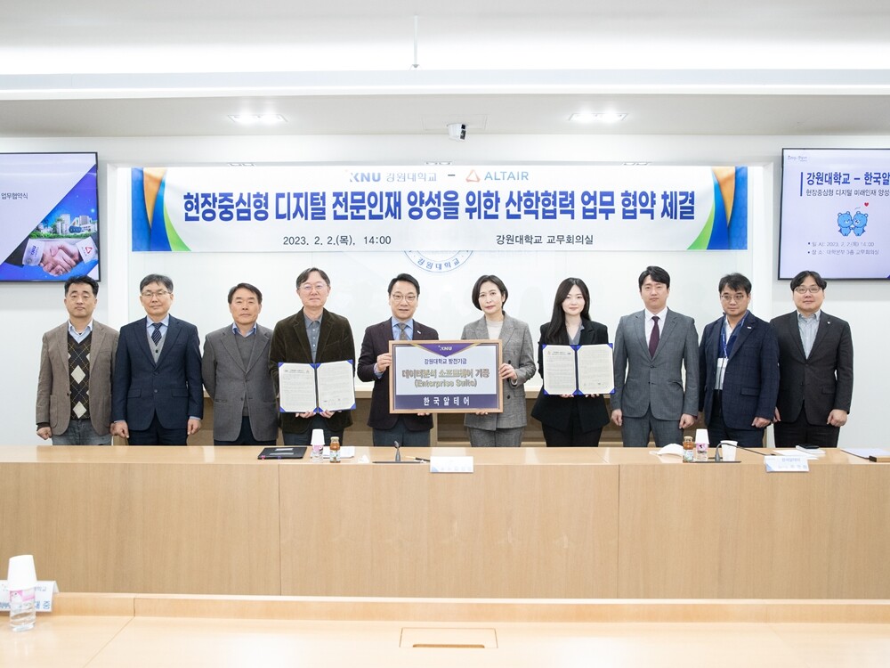 한국알테어는 협약에 따라 강원대에 150억원 상당의 데이터 분석 소프트웨어와 CAE 설계·해석 소프트웨어를 3년간 무상으로 기증해 학생들에게 산학연계 교육 프로그램과 맞춤형 지원을 제공한다.