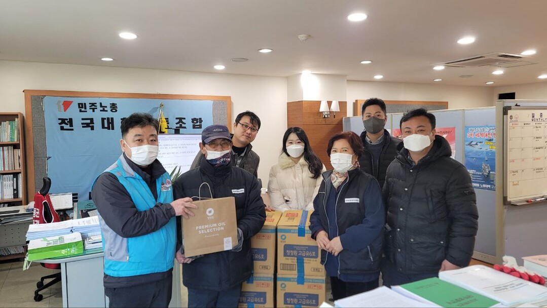 | 이재동(왼쪽) 전국대학노동조합 동명대학교지부장이 노동자들에게 설 선물을 전달하고 있다. 사진=동명대 제공 |