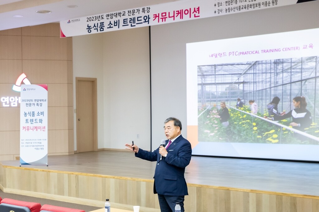 [대학저널 온종림 기자] 연암대학교는 5월 31일 연암홀에서 ‘농식품 소비 트렌드와 커뮤니케이션’을 주제로 농림수산식품교육문화정보원(이하 농정원) 이종순 원장 초청 특강을 진행했다.