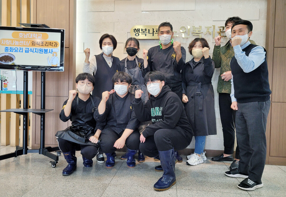 호남대 사랑나눔센터 동아리 ‘하오츠’ 회원들이 26일 광주시 광산구 소재 행복나루노인복지관에서 음식나눔 봉사를 한 뒤 기념촬영을 하고 있다. 사진=호남대 제공 |