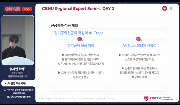 최준성 충북대 교수학습혁신센터장은 “CBNU AI-TUTOR는 단순한 학습 보조 수단을 넘어 대학의 교수학습 혁신을 견인하는 핵심 인프라”라며 “향후 인문사회와 글쓰기 등 다양한 분야로 확장 가능한 통합형 학습지원 플랫폼으로 발전시켜 학생 개별 성장 지원 체계를 더욱 고도화하겠다”고 밝혔다.