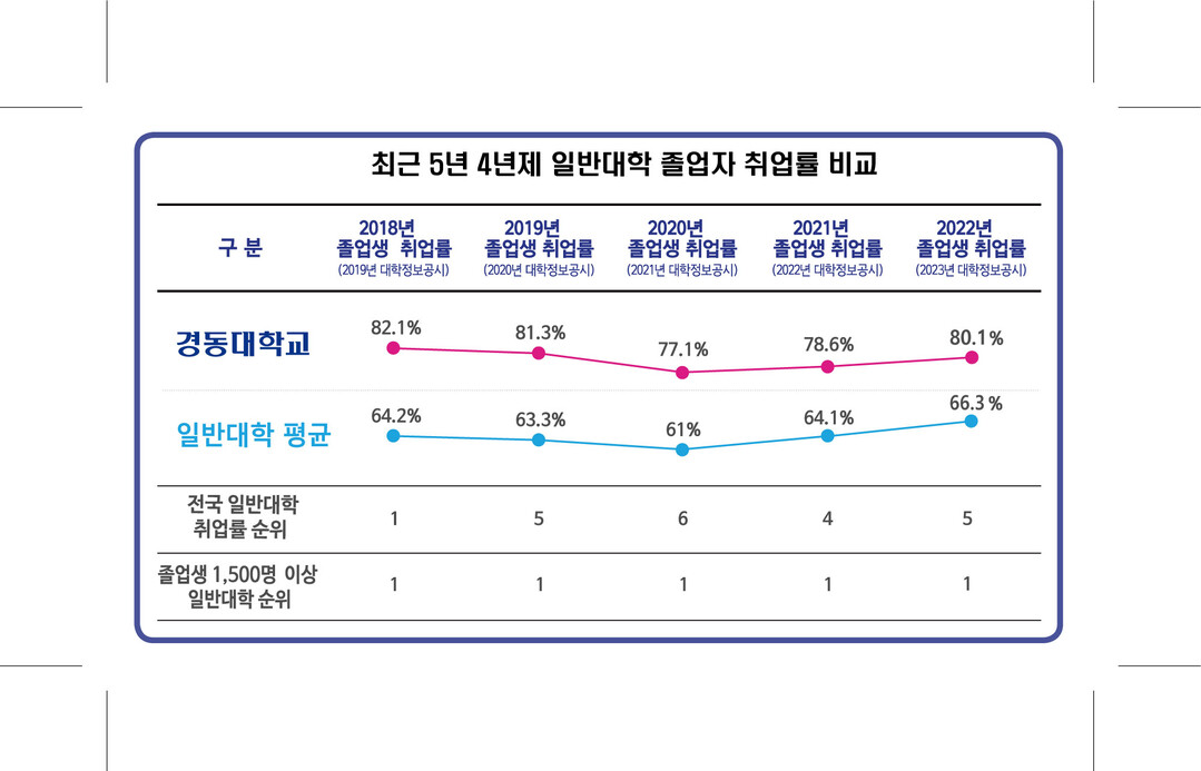 경동대는 전국 최상위 졸업생 취업률로 정평이 나 있다. 지난달 초 교육부 발표 대학 졸업생 취업률 통계에서 80.1%를 기록하였으며, 이로써 최근 5년 연속 <졸업생 1500명 이상 중대형 대학 중 취업률 1위>를 지켜오고 있다.