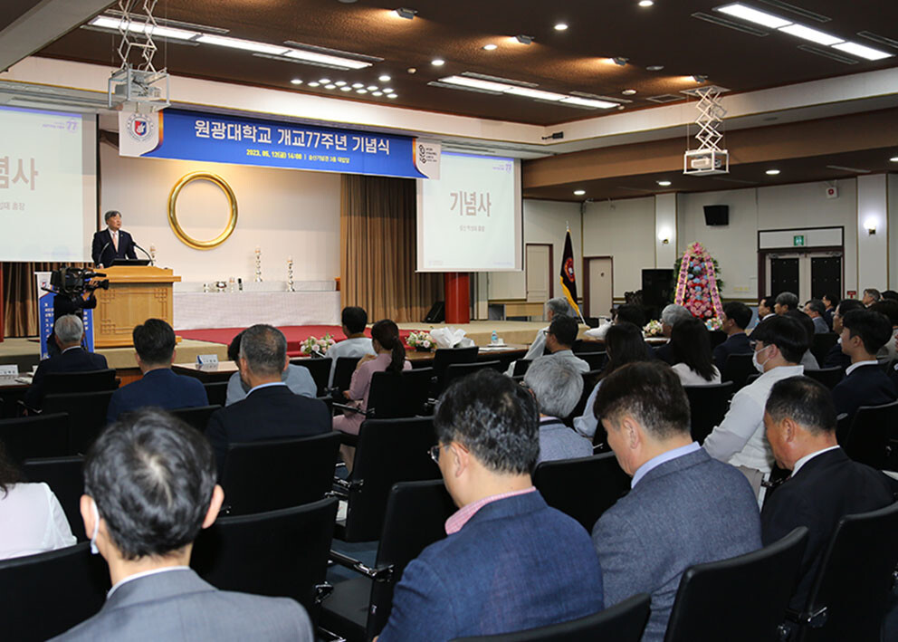 성시종 이사장은 치사를 통해 “원광학원은 오랜 역사를 이어오는 동안 지와 덕을 겸비한 인재양성을 위해 끊임없는 열정과 노력을 이어왔고, 그 열정으로 원광대는 오늘날 빛나는 대한민국의 대표사학으로 성장했다”며 “77년 역사를 기반으로 이제는 큰 희망을 품고, 학문의 미래를 여는 대학, 평화롭고 은혜로운 인류문명에 기여하는 대학으로 나아가자”고 당부했다.