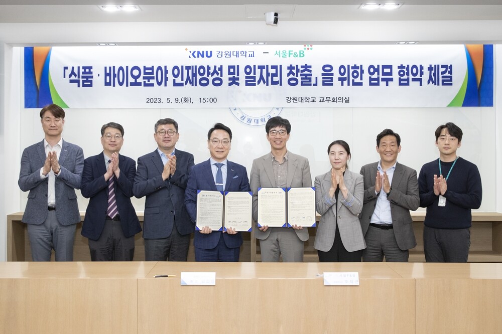 [대학저널 온종림 기자] 강원대학교가 9일 춘천캠퍼스 대학본부에서 ㈜서울F&B와 식품·바이오분야 인재 양성 및 일자리 창출을 위한 업무협약을 체결했다.