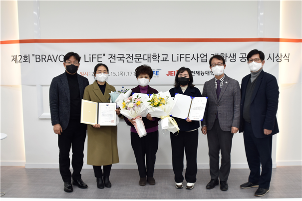 인천재능대 LiFE사업단 관계자와 학생들이 지난 15일 ‘전국전문대학교 LiFE사업 재학생 공모전 시상식’에서 대상 등을 수상한 뒤 기념촬영하고 있다. 사진=인천재능대 제공 |