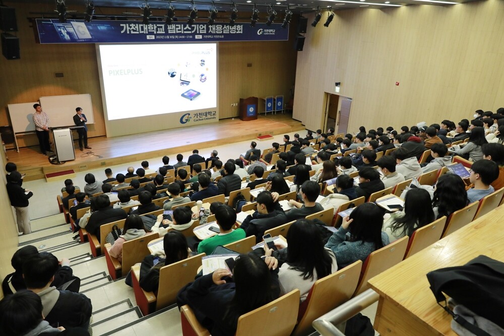 가천대가 30일 개최한 팹리스아카데미 채용설명회에서 학생들이 기업 소개 및 채용 절차에 관한 발표를 듣고 있다. 사진=가천대 제공 |