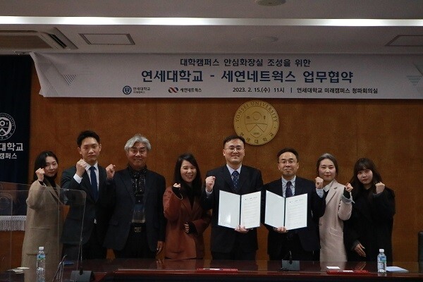 연세대 미래캠퍼스와 세연네트웍스가 ‘대학 캠퍼스 안심화장실 조성을 위한 업무협약’을 체결했다. 박우진 연세대 미래캠퍼스 학생복지처장(오른쪽에서 네 번째)과 박로성 세연네트웍스 이사(오른쪽에서 세 번째)가 협약문을 들고 있다. |