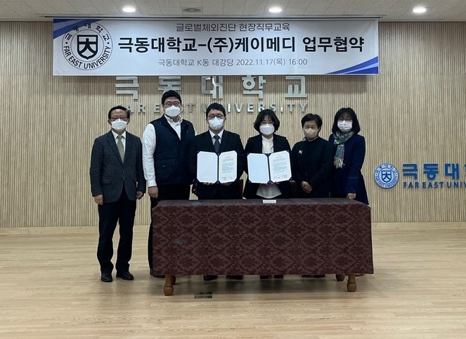 | 극동대와 케이메디 관계자들이 17일 업무협약을 체결한 뒤 기념촬영하고 있다. 사진=극동대 제공 |