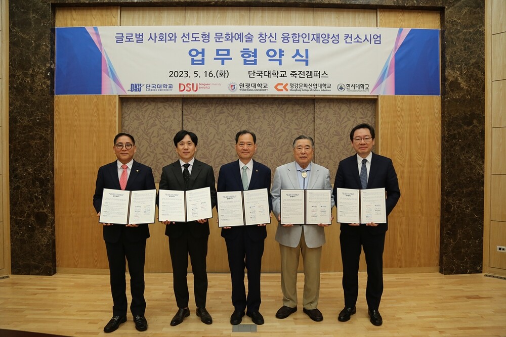 16일 단국대 죽전캠퍼스에서 열린 협약식은 주관대학인 단국대를 비롯해 권역별 참여대학인 한서대, 청강문화산업대, 원광대, 동서대 등 5개 대학의 총장 협약식과 실(처)장단 실무협약식이 별도로 열렸다.
