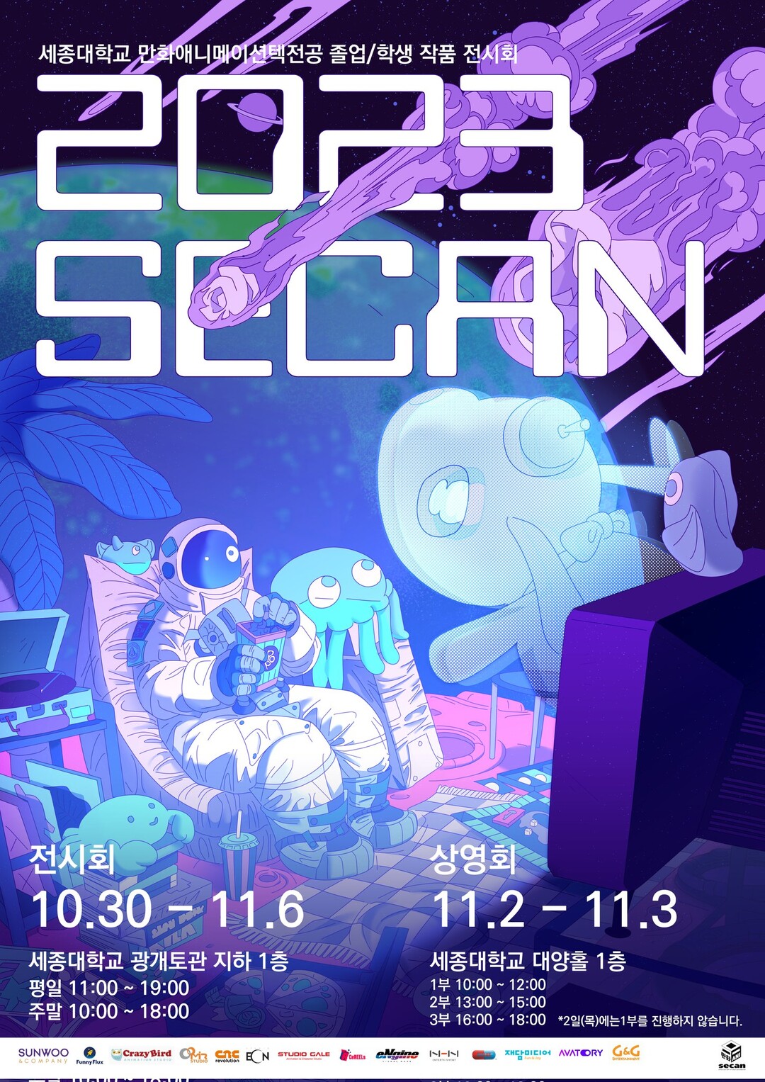 올해로 23회를 맞이한 SECAN(Sejong Comics & Animation) 전시회는 작품 전시와 영상 상영으로 나눠 진행된다. 작품 전시는 세종대 광개토관 지하 1층 세종아트갤러리에서 진행된다. 영상 상영은 11월 2일부터 3일까지 세종대 대양홀 1층에서 열리며 1부는 10시에, 2부는 13시에, 3부는 16시에 시작된다. 상영시간은 2시간이다.
