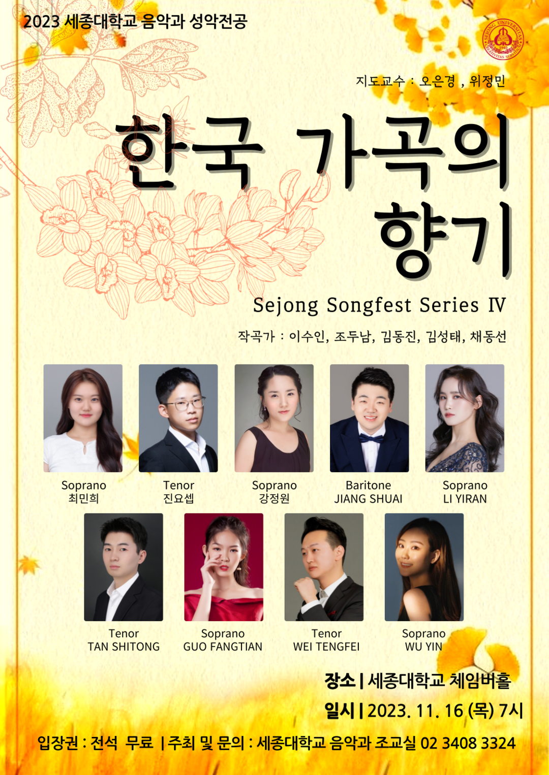 이번 연주회는 ‘한국 가곡의 향기’라는 주제로 진행된다. 대중적인 한국 서정 가곡을 작곡한 이수인, 조두남, 채동선, 김동진, 김성태 작곡가의 작품을 통해 관객들과 함께 세종대의 멋진 가을을 향유할 예정이다.입장권은 전석 무료이며 자세한 사항은 세종대 음악과 조교실로 문의하면 된다.