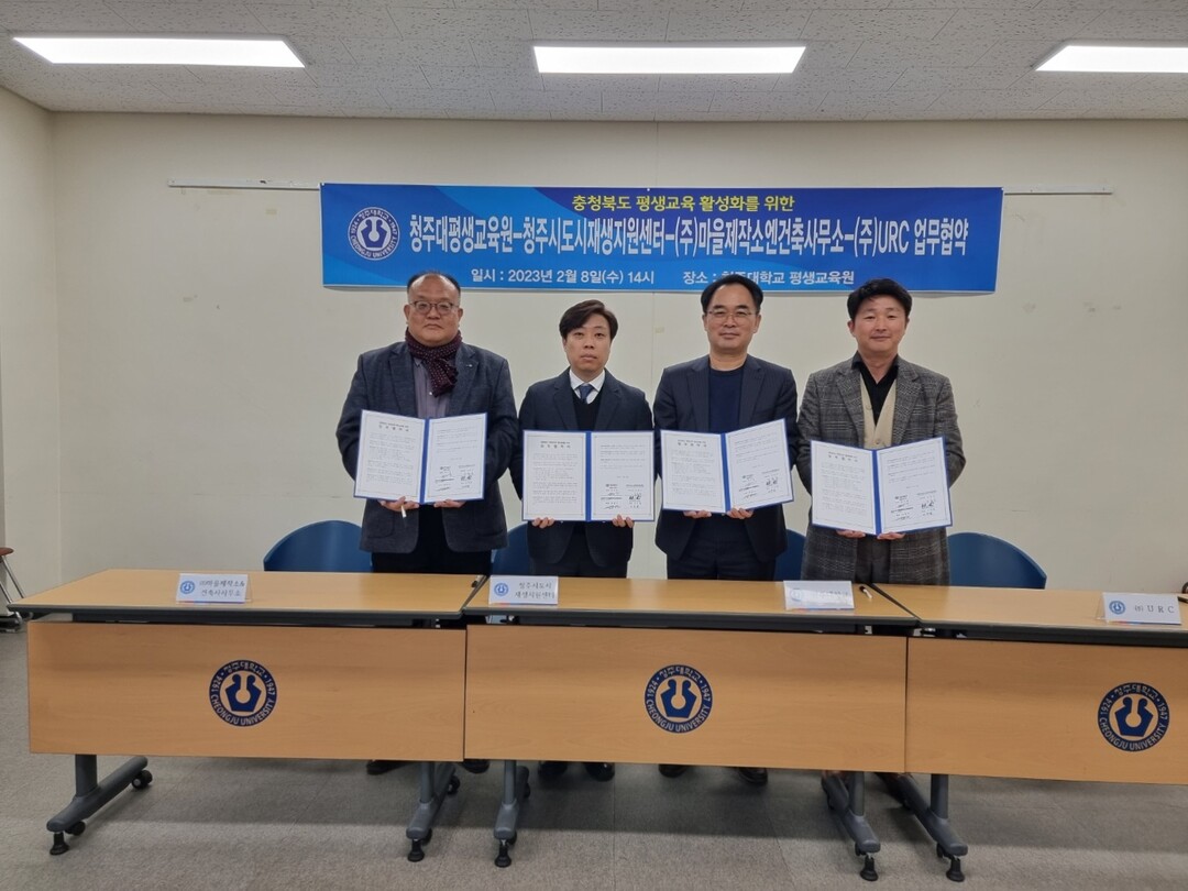 [대학저널 김진수 기자] 청주대학교 평생교육원은 충북도 평생교육 활성화를 위해 청주시도시재생지원센터, 마을제작소&건축사사무소, URC와 업무협약을 체결했다고 8일 밝혔다.