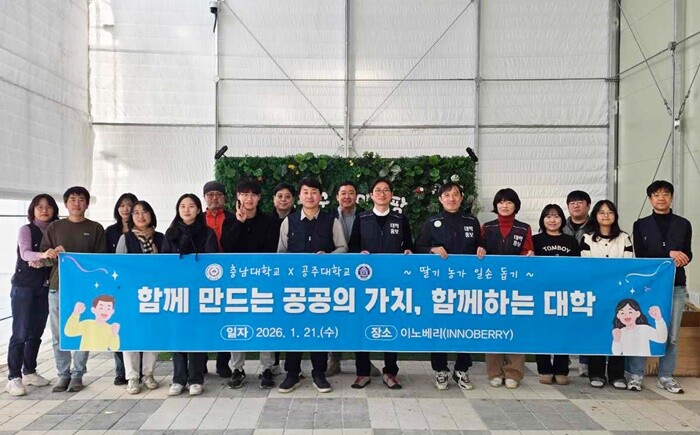 [대학저널 온종림 기자] 국립공주대학교가 21일 대전 소재 이노베리 딸기농장에서 국립공주대 협력지원본부 장재녕 본부장과 충남대 대외협력본부 김기광 본부장 등 교직원들이 참여한 가운데 딸기 농가 일손돕기 행사를 펼쳤다.