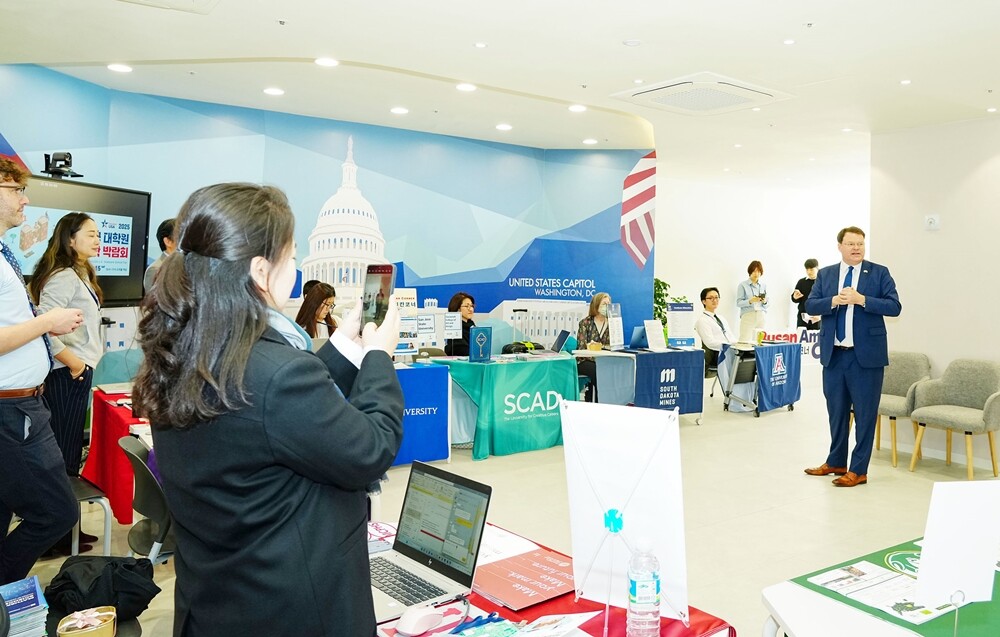 이날 오후 미래관 1층 부산아메리칸코너에서 열린 ‘2025 미국 대학원 유학박람회’에는 애리조나대학교를 비롯해 미국 11개 대학 입학업무 관계자 20여 명이 직접 부스를 마련하고 1대1 유학 상담을 진행했다.